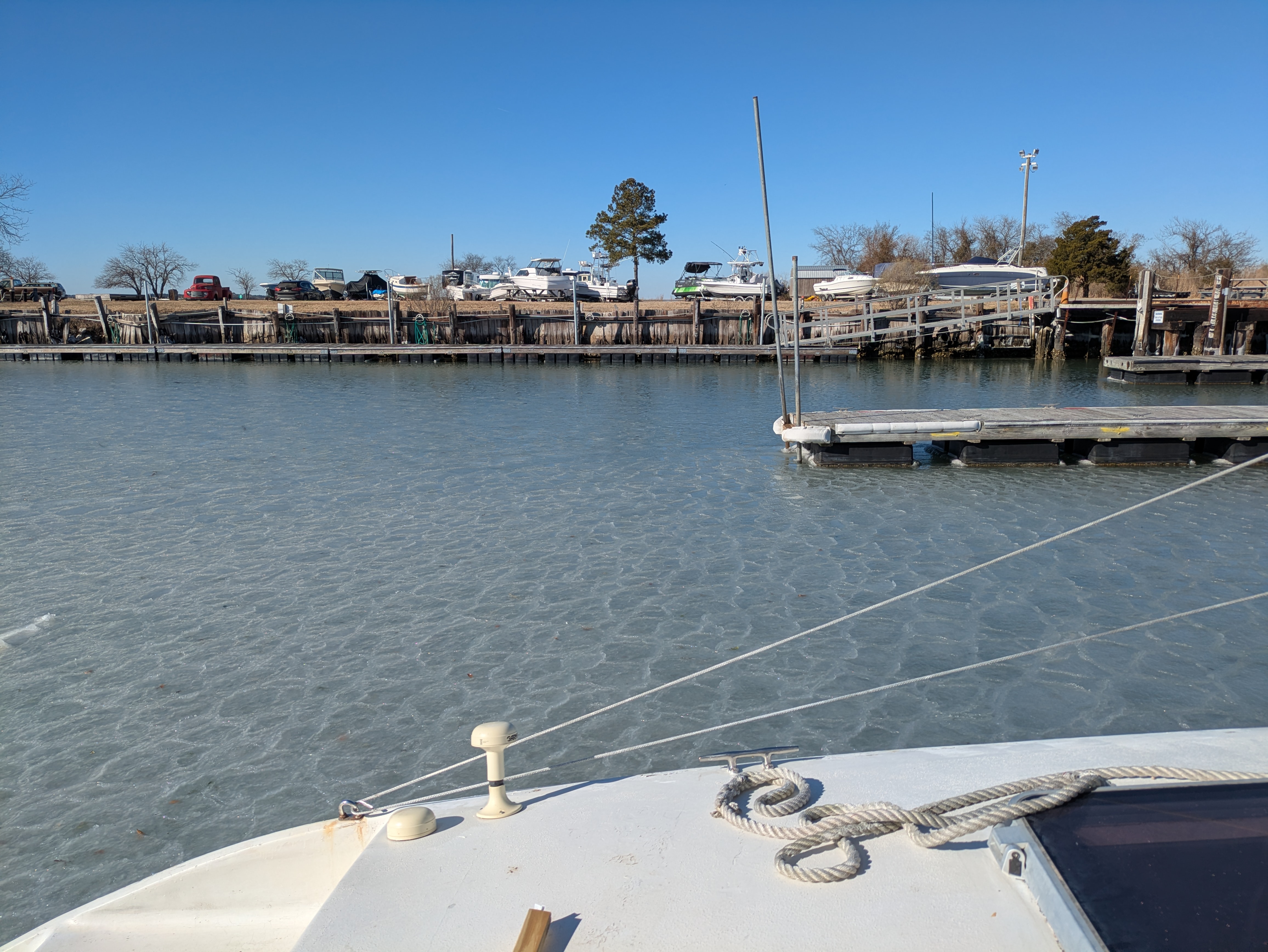 The snow and ice didn't materialize in Hampton. Very unexpeted! I woke to the realization that F&P was in the marina, with the temps in the low 20's, with over 400 gallons of water in the holding tanks. Quickly, I set out with the intent of heating her up enough to prevent anything from freezing, and if there was any water damage - to address it.